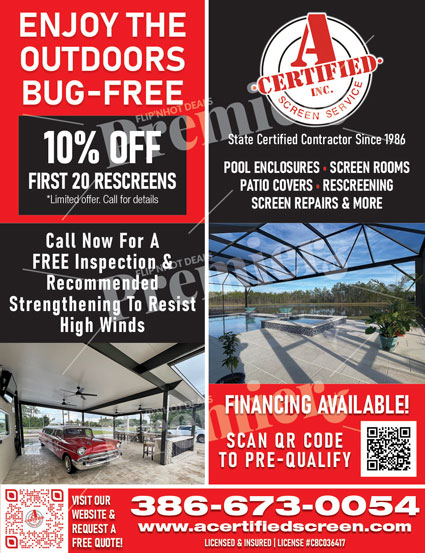 A Certified Screens Inc. has been serving Florida homeowners since 1986, offering high-quality pool enclosures, screen rooms, patio covers, and screen repairs. Their experienced โA Teamโ is known for craftsmanship, professionalism, and customer care.