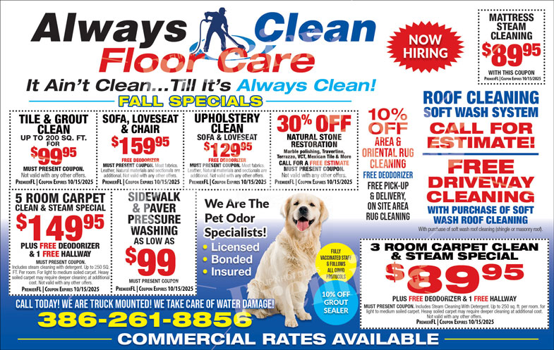 Always Clean Floor Care specializes in professional carpet cleaning services, utilizing advanced techniques to remove dirt, stains, and allergens. Serving the Port Orange area, they aim to restore the cleanliness and appearance of carpets, contributing to a healthier indoor environment. With a focus on customer satisfaction, Always Clean Floor Care ensures thorough and efficient cleaning services.