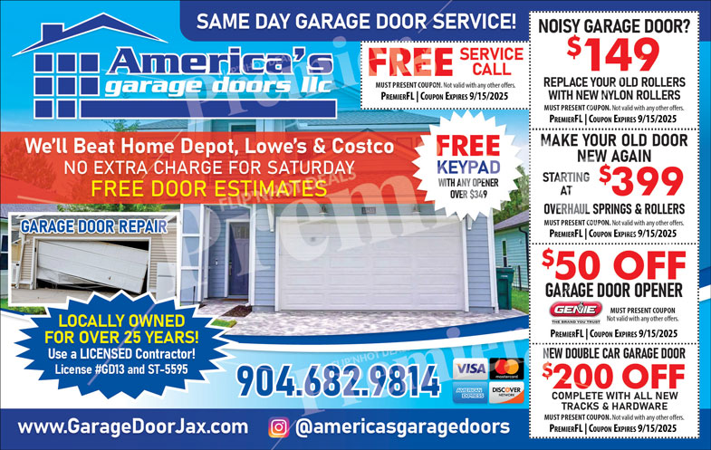 Locally owned for over 25 years, Americaโ€™s Garage Doors LLC provides fast, affordable, and reliable garage door repairs and installations. They beat competitor prices and never charge extra for Saturday service.