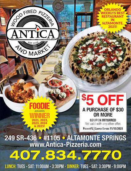 Antica Wood Fired Pizza in Altamonte Springs specializes in wood-fired pizzas made with fresh ingredients. Their menu includes a variety of pizza options, as well as other Italian dishes. The restaurant is known for its authentic flavors and casual dining experience.