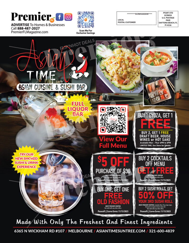 Asian Time features Asian cuisine including sushi, Thai, and Chinese dishes, offering a diverse menu to appeal to varied tastes.