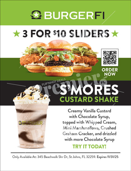 BurgerFi at St. Johns Beachwalk in St. Johns, Florida, is a fast-casual restaurant known for its chef-crafted burgers made with 100% natural American Angus beef, free from steroids, antibiotics, and growth hormones. The menu features the award-winning VegeFiยฎ Burger, along with Fried Chicken Sliders, Fi-lafel Sliders, Chicken Fingers, Fresh-Cut Fries, Frozen Custard Shakes, and draft beer. Located at 345 Beachwalk Shore Dr, #101, the restaurant offers dine-in and takeout options.