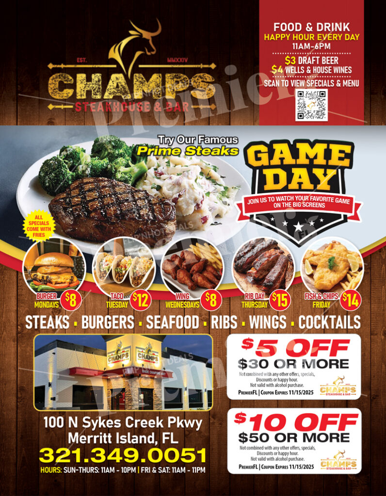 Champs Steakhouse & Bar is a family-friendly restaurant located in Viera, Florida, known for its exceptional steaks and inviting atmosphere. The menu features hand-selected cuts of beef, expertly prepared to perfection, along with a variety of other dishes and drinks. Whether you’re joining for a casual lunch, a celebratory dinner, or simply to unwind at the bar, Champs offers a memorable dining experience where moments turn into memories.