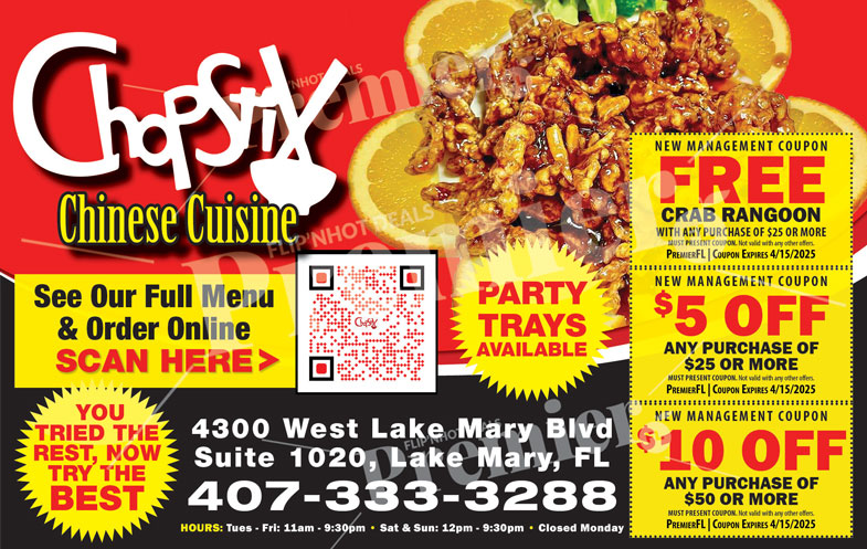 Savor authentic Chinese cuisine at ChopStix Chinese Restaurant, located in Altamonte Springs, Casselberry, DeBary, Deltona, Lake Mary, Longwood, Maitland, Orange City, Oviedo, Winter Park, and Winter Springs. They offer a variety of dishes including sushi and traditional Chinese fare. For potential savings, it’s advisable to visit local coupon platforms or contact the restaurant directly to inquire about any current promotions or discounts.