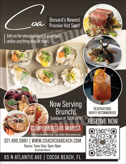 Coa is a contemporary New American fusion restaurant located at 65 N Atlantic Ave in Cocoa Beach, Florida. Housed on the ground floor of the newly constructed Surf condos, Coa offers a stylish dining experience with a menu that combines Latin-American influences and coastal Florida flavors. Signature dishes include coconut shrimp, buffalo calamari, miso black cod, and creative rice plates. The restaurant encourages a shared dining style, making it ideal for groups. Coa also features a lounge serving premium cocktails, including a nitro draft espresso martini, and an extensive wine list. Brunch is served on Sundays from 10 AM to 2 PM, and dinner is available Tuesday through Sunday from 5 PM to 10 PM. Reservations are recommended due to the restaurant’s popularity.
