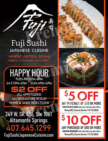 Fuji Sushi Japanese Cuisine in Altamonte Springs offers a variety of Japanese dishes, including sushi and sashimi. They provide a casual dining experience with a focus on fresh ingredients. The restaurant is known for its quality food and friendly service.