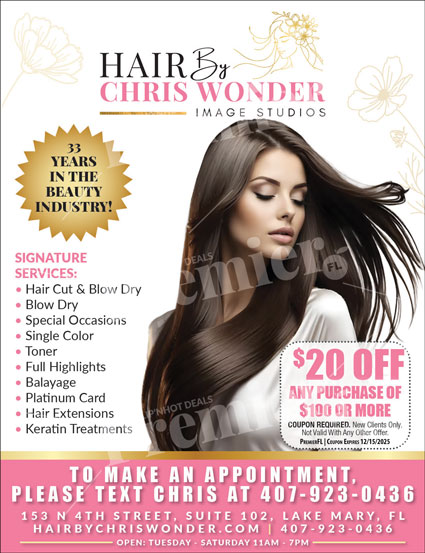 Hair By Chris Wonder is a premier image studio in Lake Mary, Florida, offering professional hair services backed by decades of experience in the beauty industry. Known for personalized consultations and refined techniques, Chris Wonder creates styles that enhance natural beauty while fitting each clientโs lifestyle. The salon provides a comfortable, boutique-style environment where quality and attention to detail come first.