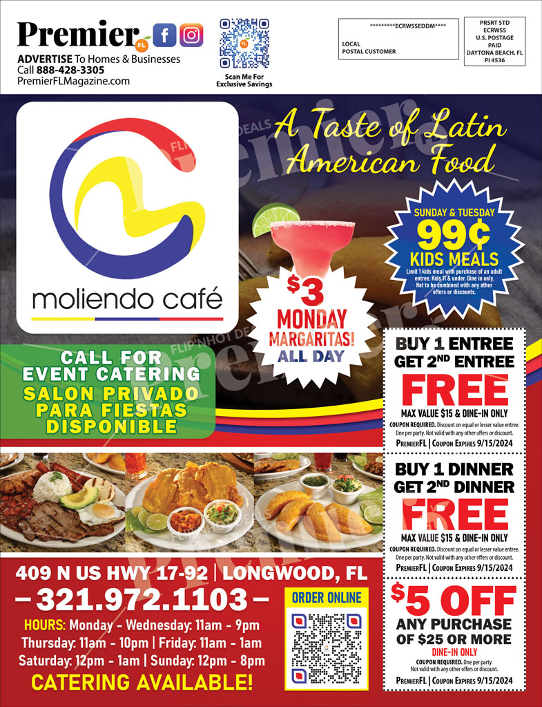 Moliendo Café in Longwood serves Latin American cuisine, including dishes like Bandeja Paisa and Peruvian rotisserie chicken. They offer breakfast on weekends and karaoke on Friday and Saturday nights.