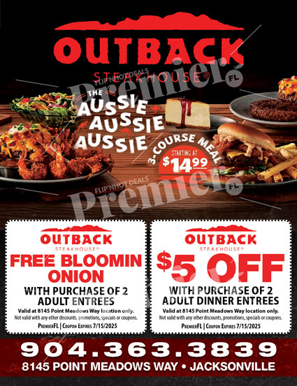 Outback Steakhouse is a casual dining chain known for its hearty American and Australian-inspired cuisine. Their menu features premium steaks, grilled meats, seafood, and signature sides like the Bloominโ Onion. They aim to deliver a warm, welcoming atmosphere and generous portions to guests looking for a satisfying sit-down dinner experience.
