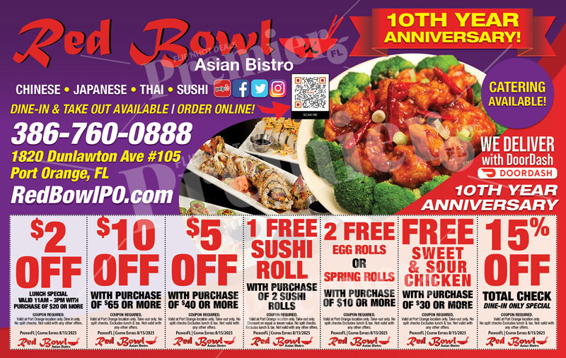 Red Bowl Asian Bistro offers a diverse menu featuring Chinese, Japanese, Thai, and Korean cuisines. Patrons can enjoy dishes like General Tsoโs chicken, pad Thai, and sushi rolls in a cozy, modern setting. The restaurant emphasizes fresh ingredients and healthy cooking methods, providing a welcoming atmosphere for both dine-in and takeout options. With attentive service and a commitment to quality, Red Bowl is a popular choice for those seeking flavorful Asian cuisine in Port Orange.