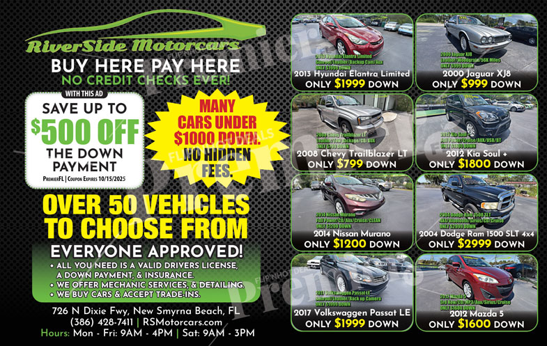 Riverside Motorcars in New Smyrna Beach, Florida, is your trusted local dealership for affordable used cars with simple, stress-free financing. Whether you have good credit, bad credit, or no credit at all, Riverside Motorcars helps you drive away today with flexible in-house financing and no credit checks required.