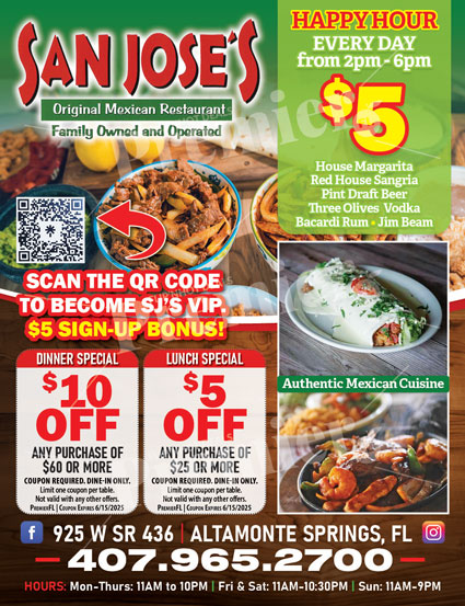San Joseโs Original Mexican Restaurant in Altamonte Springs offers traditional Mexican cuisine in a casual setting. Their menu includes a variety of dishes, and they offer an e-club for exclusive deals and updates.