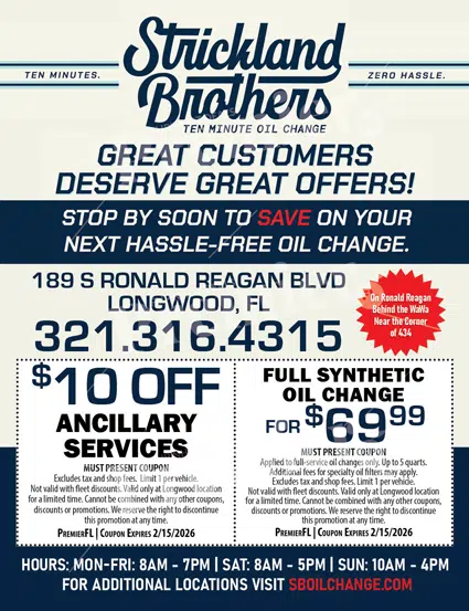 Strickland Brothers is a trusted quick oil change service in Longwood, Florida, known for fast turnaround times and a customer-first experience. Designed for busy drivers, this location offers convenient, stay-in-your-car oil changes that are typically completed in about ten minutes. With no appointments required, Strickland Brothers makes routine vehicle maintenance simple and stress-free.